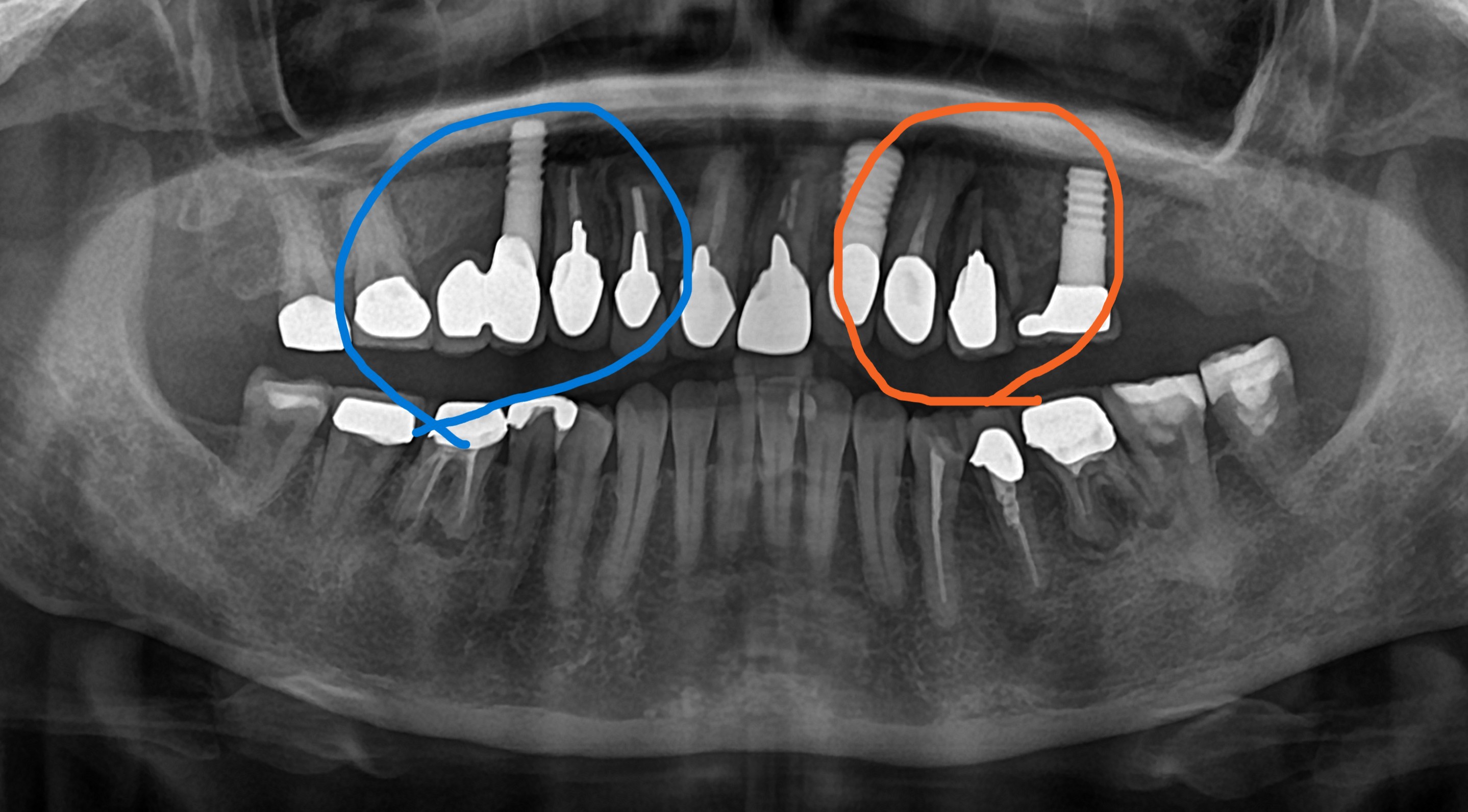 先日、ある患者さんの紹介でインプラントを希望する方が来院しました。オレンジ色の線で囲まれている部分の歯が割れているのでその歯を抜いてインプラントを希望していました。患者さんは割れた歯が気になっていたま...